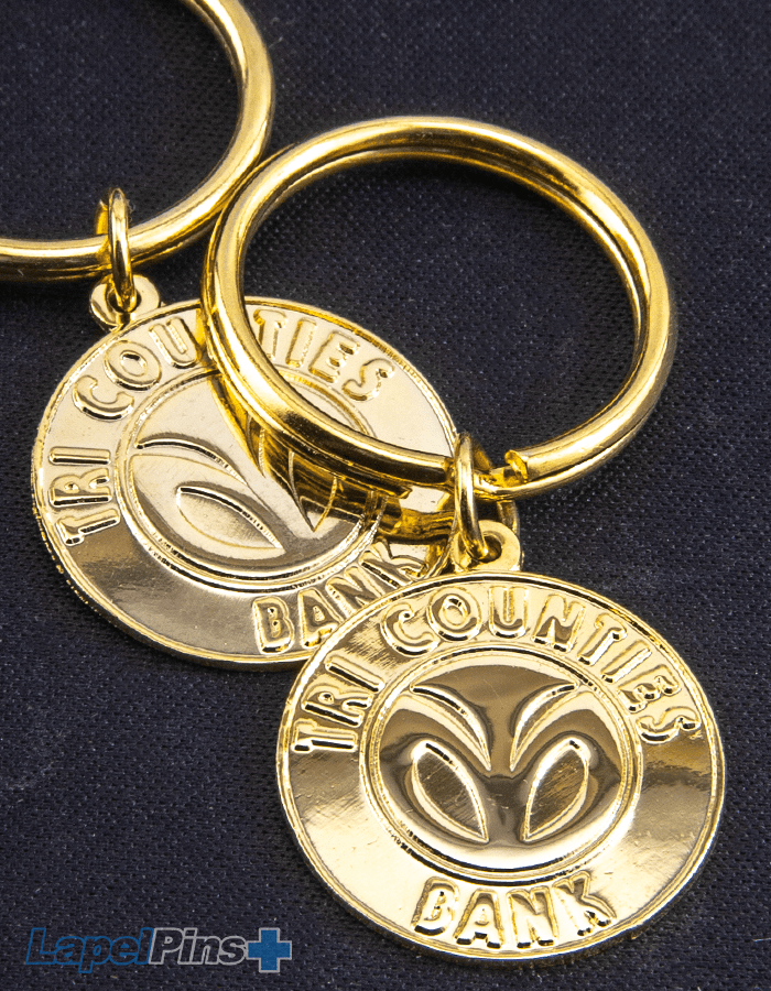 Die Struck Keychains are free of enamel color fills and plated instead with one or more metal choices over the surface of the keychain design.